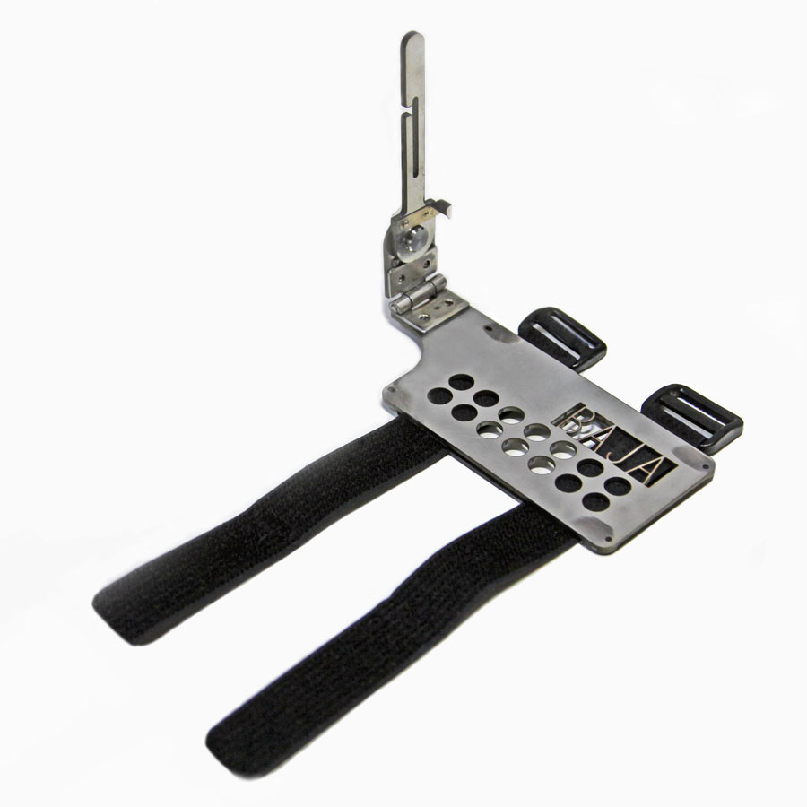 一見すると重そうに見えますが、実際にはパイプなので600gと意外に軽いです。回転する先端軸受けをブレーキペダルのシャフトに差し込んで押すことにより、ある程度しっかりブレーキを効かせることが出来ます。取り外しはグリップの近くにあるレバーを引けばシャフト内部を通ったワイヤーが口を開いて外れる仕組み。